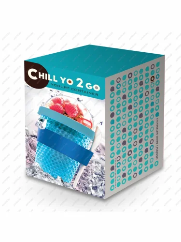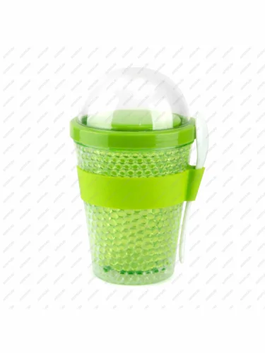 Контейнер-термос для перекусов объемом 386 мл с двойными стенками из прочного акрила и гелем-хладогентом, крышкой с защитой от проливания и дополнительной емкостью для топпингов или других добавок.
