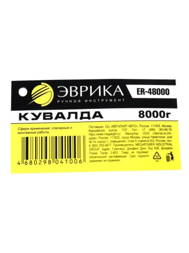 | Наименование | Кувалда 8.0кг фибергласовая ручка ЭВРИКА в Керчи Республика Крым |
