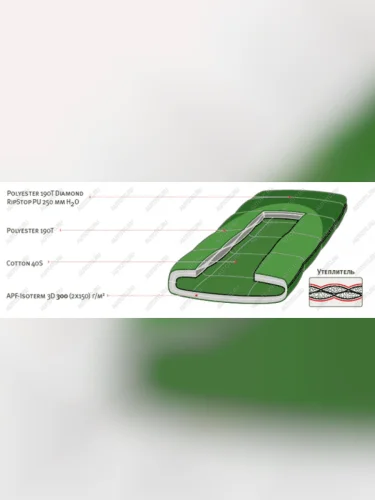 Нижняя часть спальника и область ног (более темного цвета) сшита из не продуваемой, влагозащитной и прочной ткани, усиленной плетением RipStop (ткань усилена толстой и прочной нитью в горизонтальном и вертикальном направлении с шагом в 2 мм). С внешней стороны материал обработан пропиткой WR (water repellent), а с внутренней стороны покрыт слоем полиуретана с водонепроницаемостью 250 мм водного столба. Центральная часть спальника (светлая ткань) сделана из паропроницаемой ткани,что позволяет спальнику дышать, выпускать пар и не конденсировать влагу внутри. Следующим слоем после ткани идет синтетический утеплитель APF Isoterm 3D - вспушенное волокно с воздушными каналами и силиконовым покрытием для уменьшения сваливания волокон и предотвращения впитывания влаги. Двухслойный утеплитель сформирован в пакеты, смещенные относительно друг друга на половину ширины пакета, что позволяет значительно сократить потери тепла через швы. Если вам холодно, затяните шнуры затяжки вокруг плеч, и тепло не покинет вас.