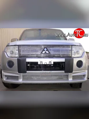 Объёмная накладка выполнена в виде дополнительной части к переднему бамперу Mitsubishi Pajero 4 V90 дорестайлинг (2006-2011) , создавая более массивный вид передней части автомобиля. Контур накладки повторяет контур бампера, а в нижней части расположены элементы, придающие ему дополнительную защиту от повреждений. Накладка создаёт машине более спортивные черты – её угловатые формы и острые грани подчёркивают мужской стиль автомобиля Mitsubishi Pajero 4 V90 дорестайлинг (2006-2011). Объёмный воздухозаборник и боковые воздуховоды, обрамлённые массивными рёбрами жёсткости, а также выдающейся вперед нижней части накладки – внушительный дизайнерский подход к создаваемому образу авто.