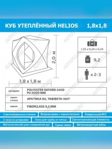 Палатка зимняя утепленная КУБ Helios легко ставится одним человеком в любую погоду. Форма очень удобная для рыболовов, в такой палатке удобно ловить рыбу одному или с другом. НО, многие используют палатки типа КУБ в качестве мобильных бань в автопутешествиях.