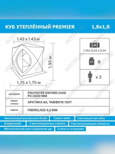 Зимняя палатка КУБ Комфорт утепленный торговой марки Premier fishing предназначена для защиты от неблагоприятных погодных условий во время зимней рыбалки.