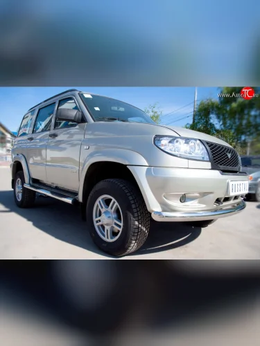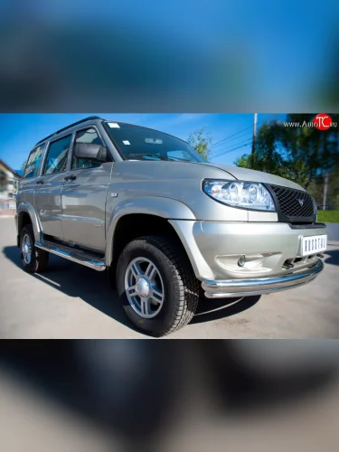 Защита порогов с пластиковыми вставками для ног из круглой трубы диаметром 76 мм Russtal Уаз Патриот 3163 5 дв. дорестайлинг (2005-2013) (Защита порогов с со скосами на торцах (вариант 1)) в Керчи Республика Крым