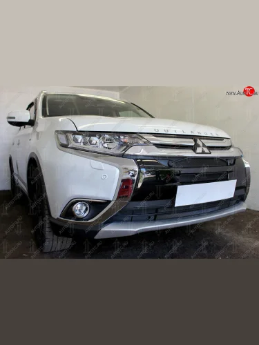 Защитная сетка в бампер (4 части, с парктроником и камерой, ячейка 3х7 мм) Alfeco Стандарт Mitsubishi Outlander GF 2-ой рестайлинг (2015-2018) (Хром) в Керчи Республика Крым